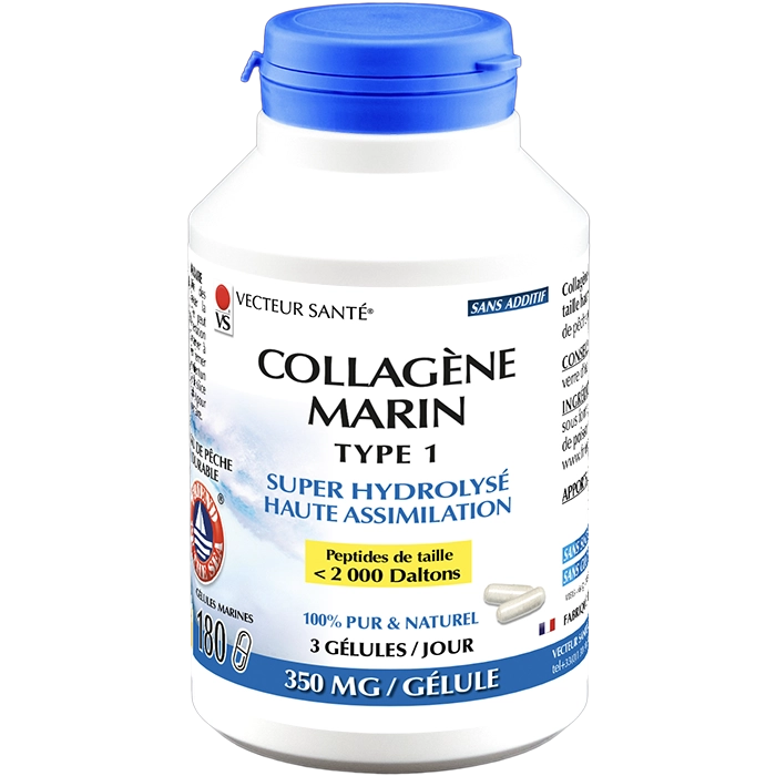 COLLAGÈNE MARIN 180 GÉLULES Collagène marin gélules de Type 1 super hydrolysé, désodorisé, peptide de taille < 2000 daltons. Informations