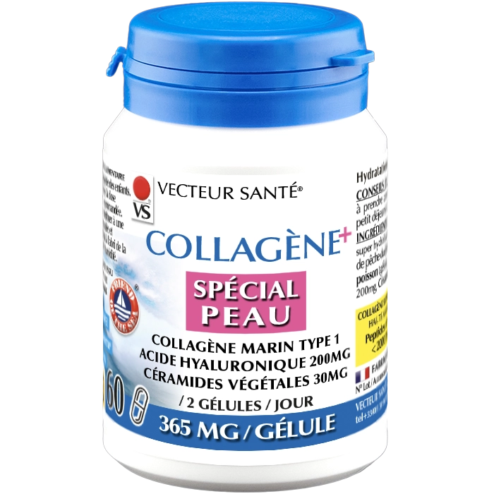 COLLAGÈNE+ SPÉCIAL PEAU Collagène marin Type I super hydrolysé, acide hyaluronique végétal, céramides de blé – formule ciblée peau mature. Informations