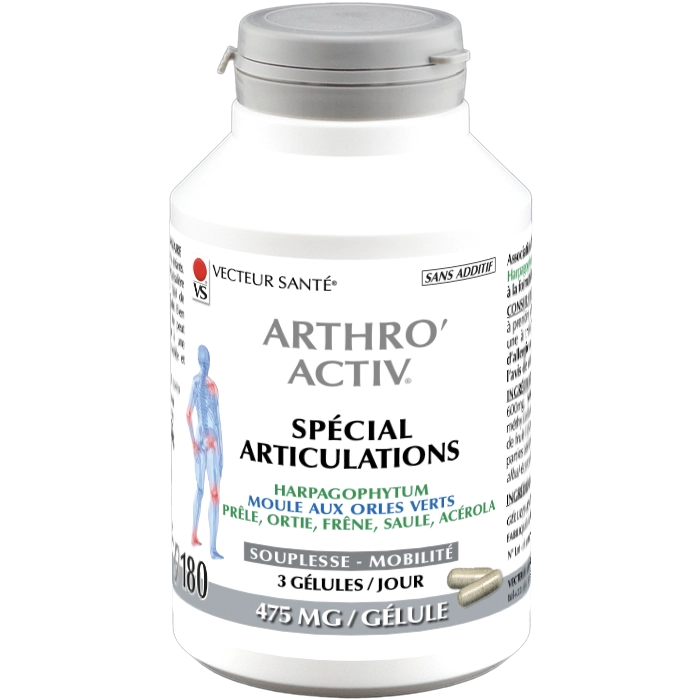 ARTHRO’ACTIV® HARPAGOPHYTUM SPÉCIAL ARTICULATIONS 180 GÉLULES ARTHRO’ACTIV – moule aux orles verts, harpagophytum, prêle, saule, frêne, acérola – confort articulaire & mobilité. Informations