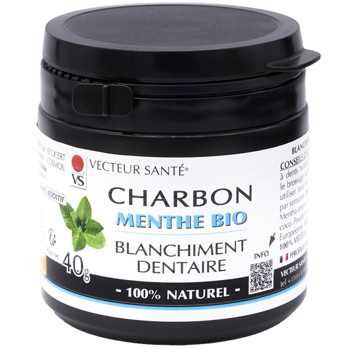 CHARBON VÉGÉTAL BLANCHIMENT DENTAIRE MENTHE BIO Charbon dentaire végétal super micronisé – blancheur, hygiène buccale, haleine fraîche – Menthe Bio – 100 % naturel, sans... Informations