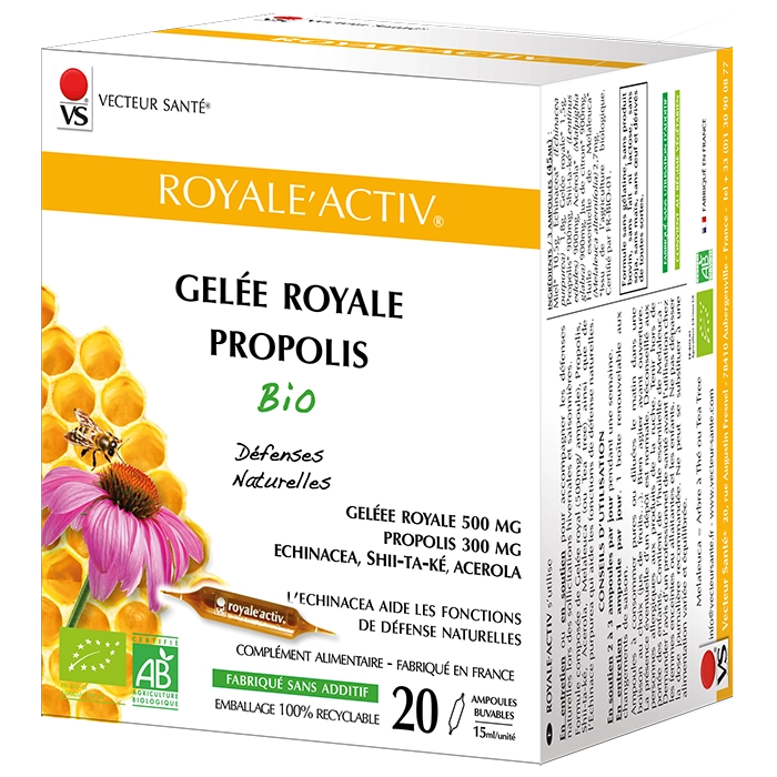 ROYALE’ACTIV® GELÉE ROYALE PROPOLIS BIO Royale’Activ – gelée royale, propolis, échinacée, shiitaké, acérola – système immunitaire & résistance saisonnière. Informations