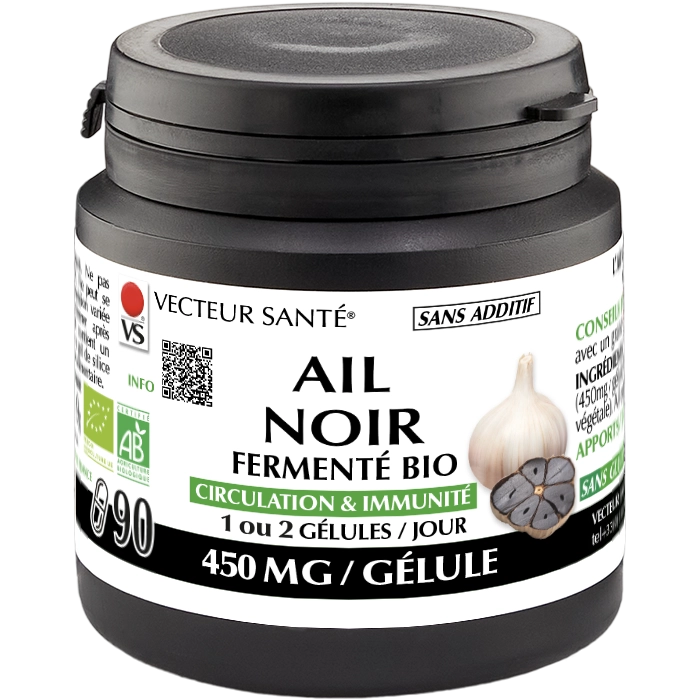 AIL NOIR FERMENTÉ BIO CIRCULATION IMMUNITÉ Ail Noir Fermenté Bio – 450 mg/gélule – circulation, immunité et antioxydant – sans odeur, sans additif. Informations