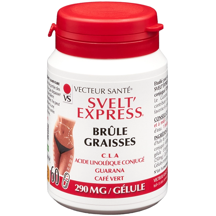 SVELT’EXPRESS® BRÛLE GRAISSES Svelt’Express Brûle Graisses – C.L.A, guarana et café vert – réduction des graisses localisées et soutien de l’énergie. Informations