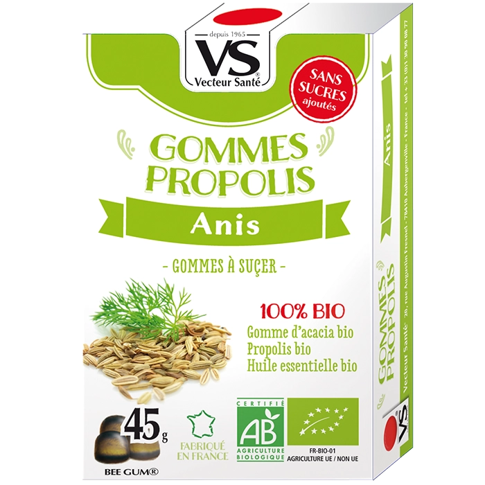 GOMMES BIO PROPOLIS ANIS Gommes à la propolis et anis bio – sans sucres ajoutés – gorge irritée, haleine fraîche et bien-être hivernal. Informations