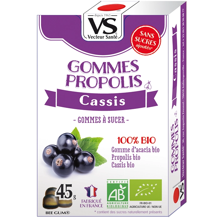 GOMMES BIO PROPOLIS CASSIS Gommes à la propolis et cassis bio – sans sucres ajoutés – gorge irritée, haleine fraîche et bien-être hivernal. Informations