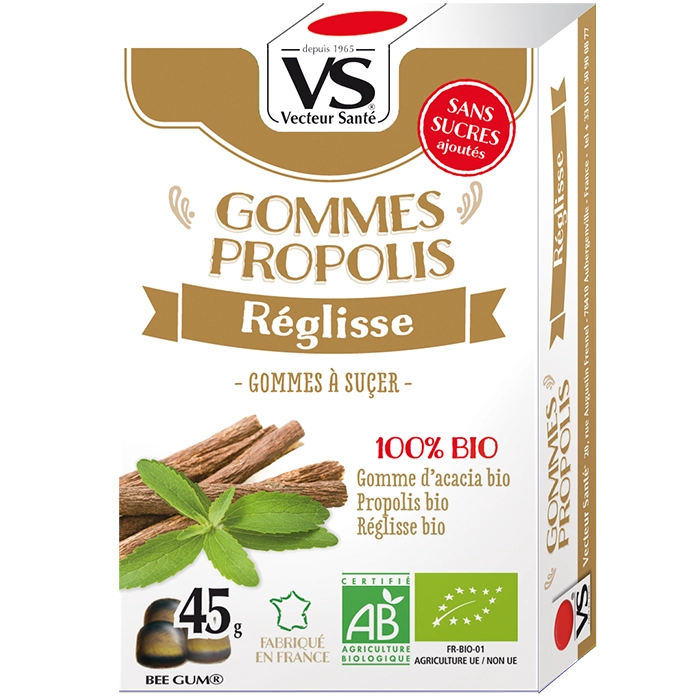 GOMMES BIO PROPOLIS RÉGLISSE Gommes à la propolis et réglisse bio – sans sucres ajoutés – gorge irritée, haleine fraîche et bien-être hivernal. Informations